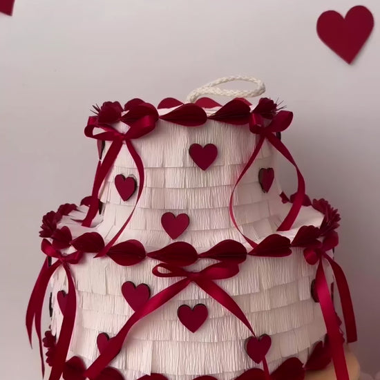 A white tiered cake piñata decorated with red ribbons and heart details, perfect for Valentine’s Day or love-themed celebrations. Simple, sweet, and charming.